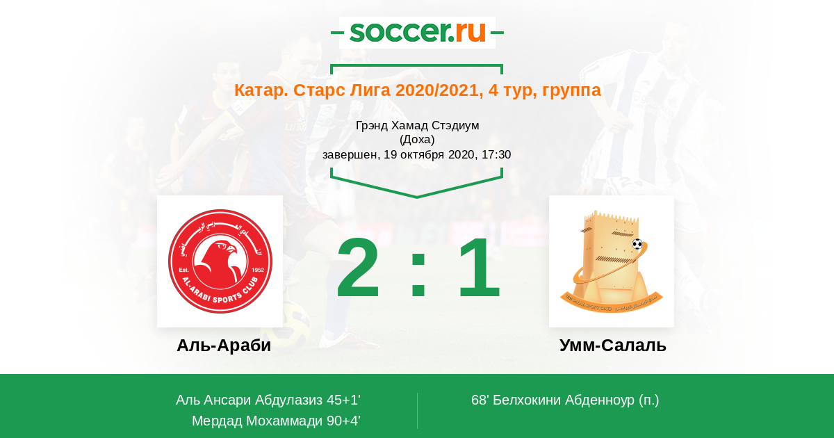 Катар. Старс Лига 14.10.2017 Умм-Салаль Логотип футбольный клуб Умм-Салаль 4:1 Логотип футбольный клуб Аль-Араби (Доха) Аль-Араби
