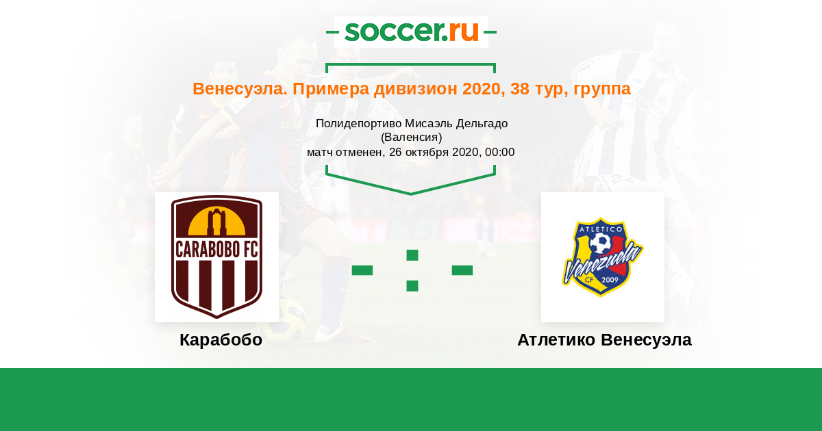 Венесуэла. Примера дивизион 22.10.2020 Карабобо Логотип футбольный клуб Карабобо (Валенсия) 0:0 Логотип Атлетико Венесуэла (Майкуетья) Атлетико Венесуэла