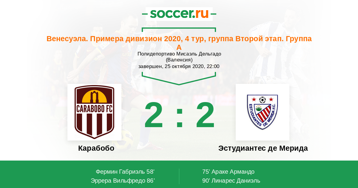 Венесуэла. Примера дивизион 26.11.2020 Эстудиантес Мерида Логотип футбольный клуб Эстудиантес Мерида 3:2 Логотип футбольный клуб Карабобо (Валенсия) Карабобо