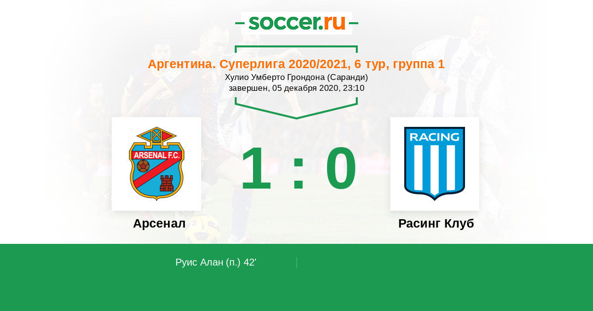 Аргентина. Суперлига 15.11.2020 Расинг Клуб Логотип футбольный клуб Расинг Клуб (Авельянеда) 0:2 Логотип футбольный клуб Арсенал (Саранди) Арсенал