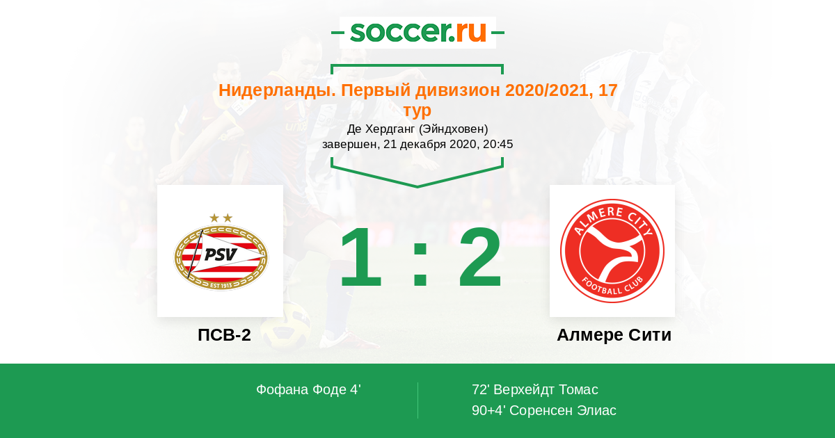 Нидерланды. Первый дивизион 15.12.2017 ПСВ-2 Логотип футбольный клуб ПСВ-2 (Эйндховен) 3:2 Логотип футбольный клуб Алмере Сити Алмере Сити