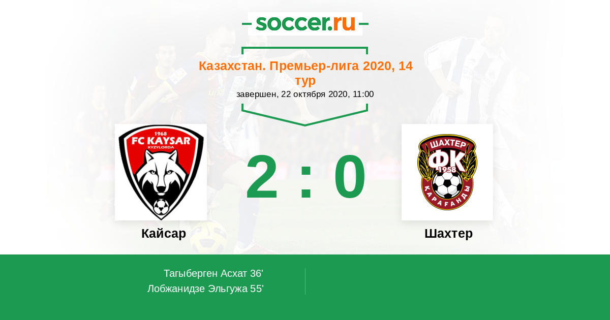 Казахстан. Премьер-лига 19.08.2020 Шахтер Логотип футбольный клуб Шахтер (Караганда) 0:1 Логотип футбольный клуб Кайсар (Кызылорда) Кайсар