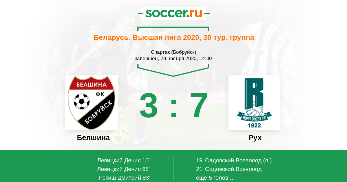 Беларусь. Высшая лига 28.06.2020 Рух Логотип футбольный клуб Рух (Брест) 3:0 Логотип футбольный клуб Белшина (Бобруйск) Белшина