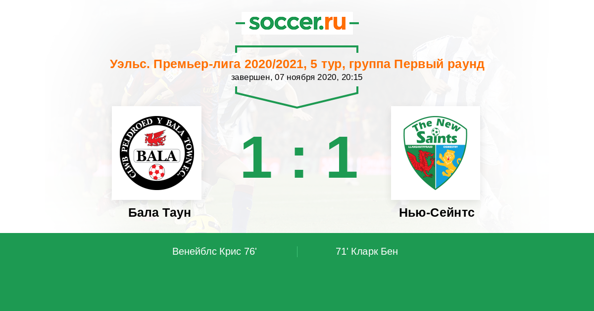 Уэльс. Премьер-Лига 30.09.2020 Бала Таун Логотип футбольный клуб Бала Таун 2:2 Логотип футбольный клуб Нью-Сейнтс (Ллансантффрайд) Нью-Сейнтс