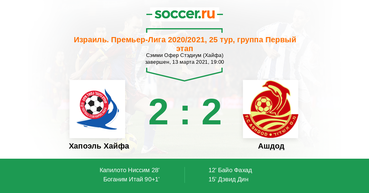 Израиль. Премьер-Лига 25.12.2021 Хапоэль Хайфа Логотип футбольный клуб Хапоэль Хайфа 2:1 Логотип футбольный клуб Ашдод Ашдод