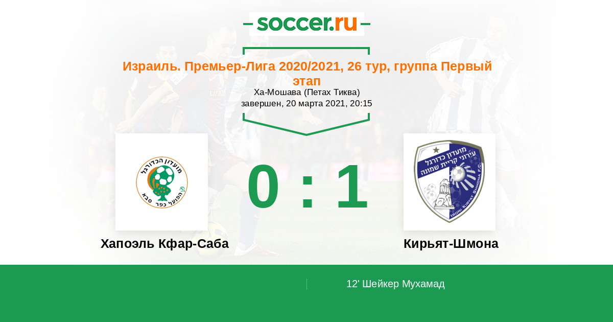 Израиль. Премьер-Лига 20.06.2020 Хапоэль Кфар-Саба Логотип футбольный клуб Хапоэль Кфар-Саба 0:0 Логотип футбольный клуб Кирьят-Шмона Кирьят-Шмона