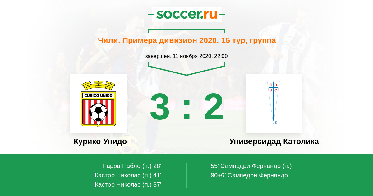 Чили. Примера дивизион 17.04.2021 Универсидад Католика Логотип футбольный клуб Универсидад Католика (Сантьяго) 2:1 Логотип футбольный клуб Курико Унидо Курико Унидо
