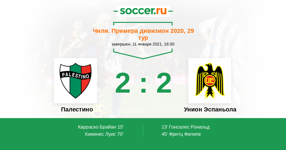 Чили. Примера дивизион 10.02.2018 Унион Эспаньола Логотип футбольный клуб Унион Эспаньола (Сантьяго) 2:2 Логотип футбольный клуб Палестино (Сантьяго) Палестино