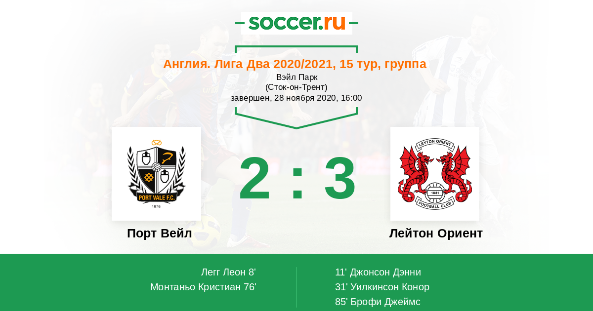 Англия. Вторая Футбольная Лига 02.10.2021 Порт Вейл Логотип футбольный клуб Порт Вейл (Сток-он-Трент) 3:2 Логотип футбольный клуб Лейтон Ориент Лейтон Ориент