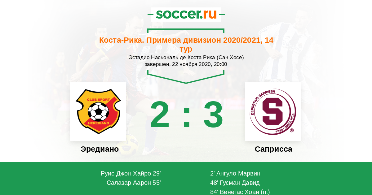 Коста-Рика. Примера дивизион 10.12.2020 Эредиано Логотип футбольный клуб Эредиано 3:0 Логотип футбольный клуб Саприсса (Сан Хосе) Саприсса