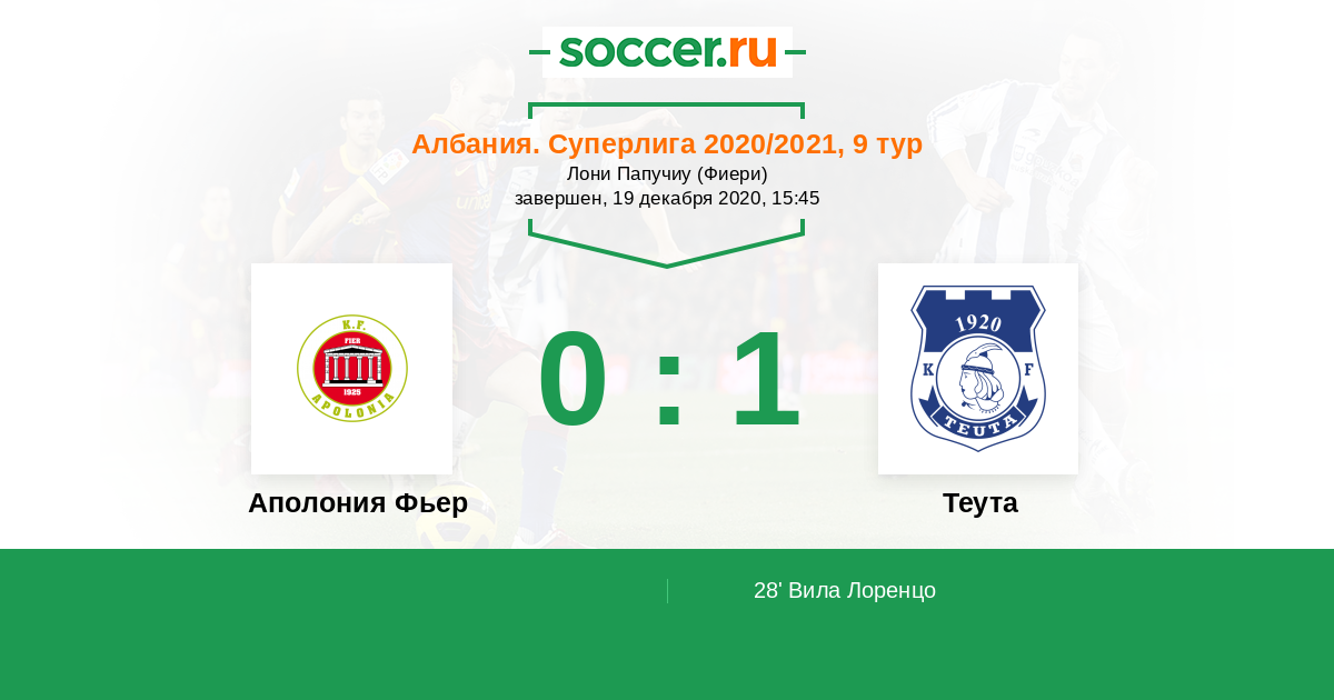 Албания. Суперлига 06.02.2021 Теута Логотип футбольный клуб Теута (Дуррес) 1:0 Логотип футбольный клуб Аполония Фьер Аполония Фьер