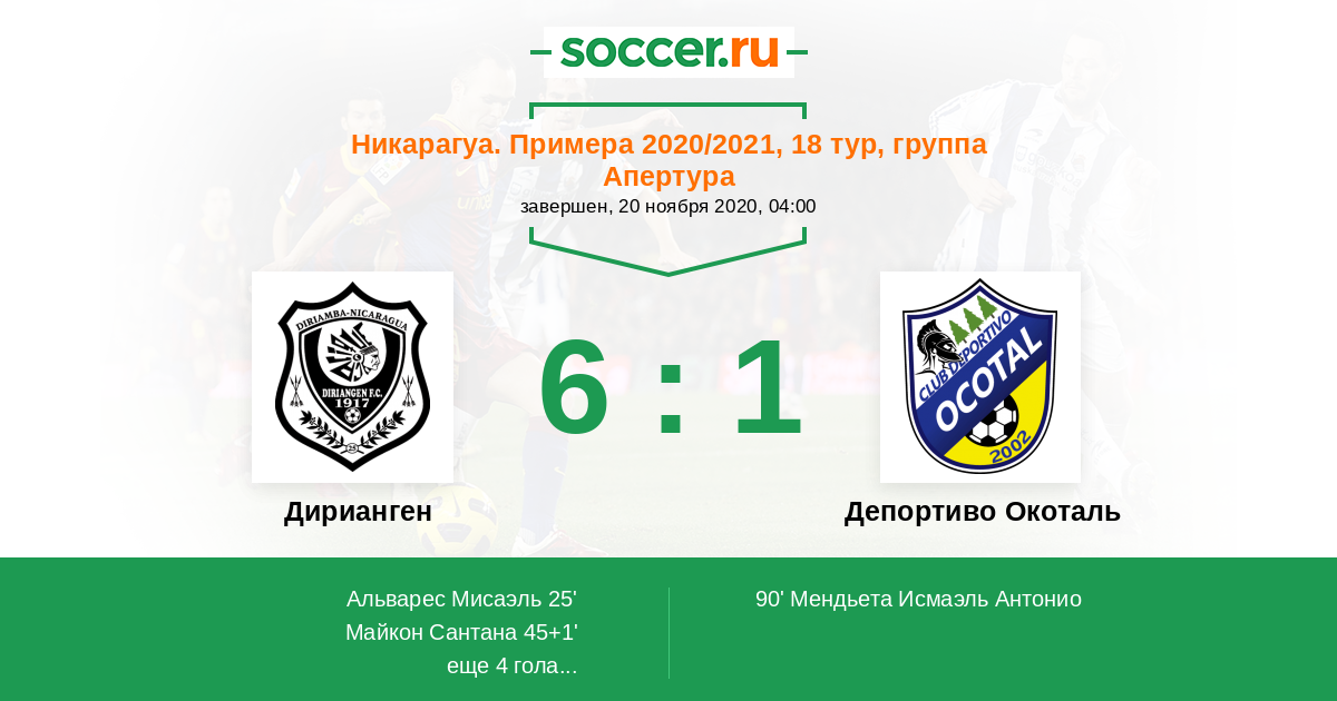 Никарагуа. Примера 20.09.2020 Депортиво Окоталь Логотип футбольный клуб Депортиво Окоталь 1:0 Логотип футбольный клуб Дирианген (Дириамба) Дирианген