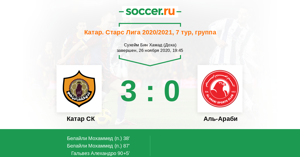 Катар. Старс Лига 30.09.2017 Аль-Араби Логотип футбольный клуб Аль-Араби (Доха) 2:1 Логотип футбольный клуб Катар СК (Доха) Катар СК