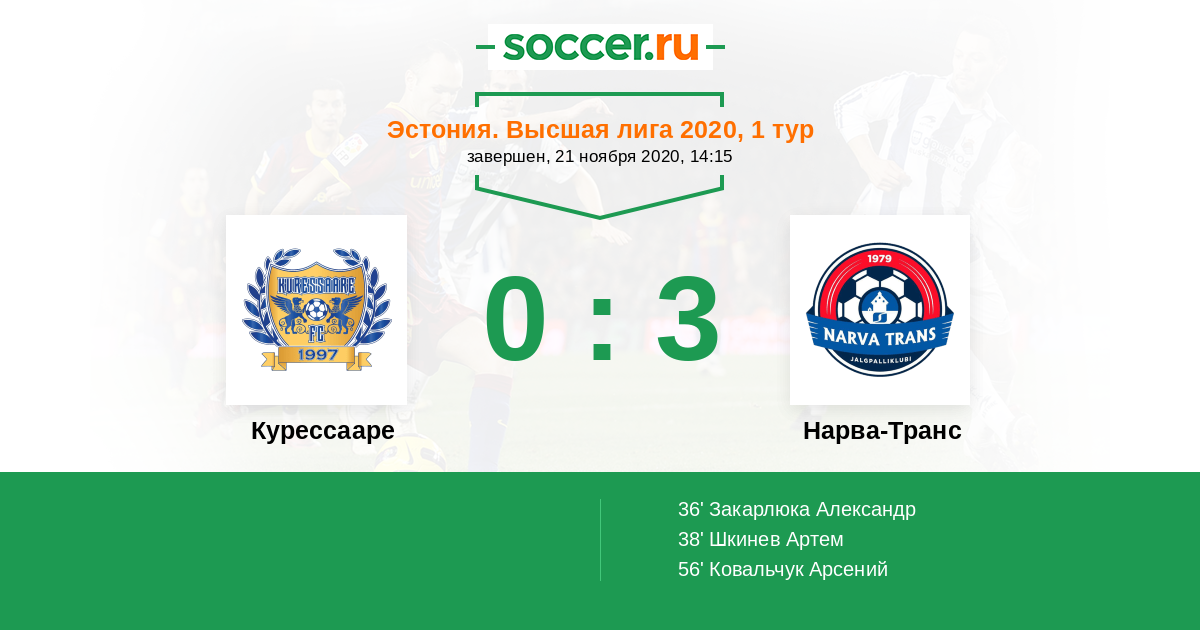 Эстония. Высшая лига 25.04.2021 Нарва-Транс Логотип футбольный клуб Нарва-Транс 2:0 Логотип футбольный клуб Курессааре Курессааре