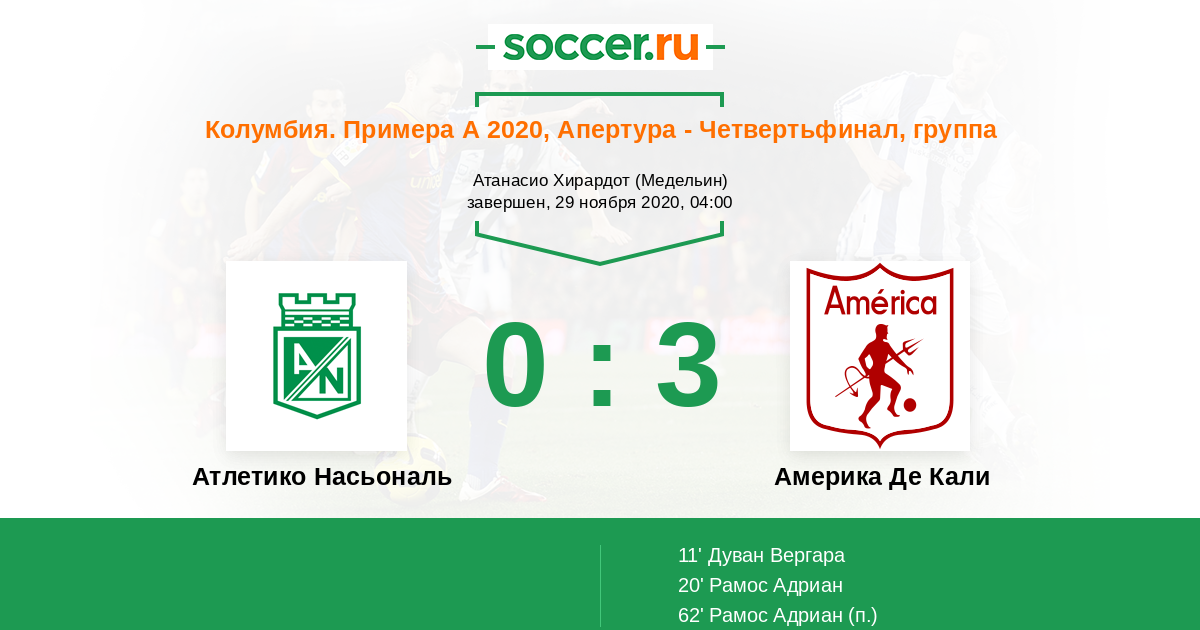 Колумбия. Примера А 22.11.2020 Америка Де Кали Логотип футбольный клуб Америка Де Кали 1:2 Логотип футбольный клуб Атлетико Насьональ (Медельин) Атлетико Насьональ