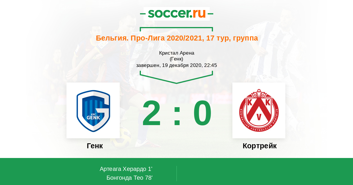 Бельгия. Про-Лига 21.02.2020 Кортрейк Логотип футбольный клуб Кортрейк 0:1 Логотип футбольный клуб Генк Генк