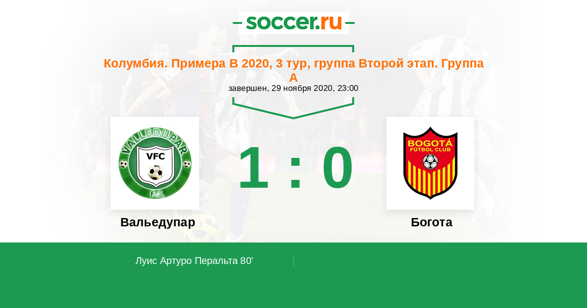 Колумбия. Примера B 04.10.2014 Богота Логотип футбольный клуб Богота 0:1 Логотип футбольный клуб Вальедупар Вальедупар