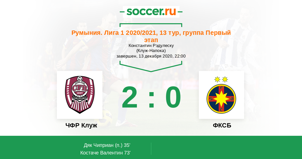Румыния. Лига 1 31.07.2020 ФКСБ Логотип футбольный клуб ФКСБ (Бухарест) 0:2 Логотип футбольный клуб ЧФР Клуж (Бухарест) ЧФР Клуж