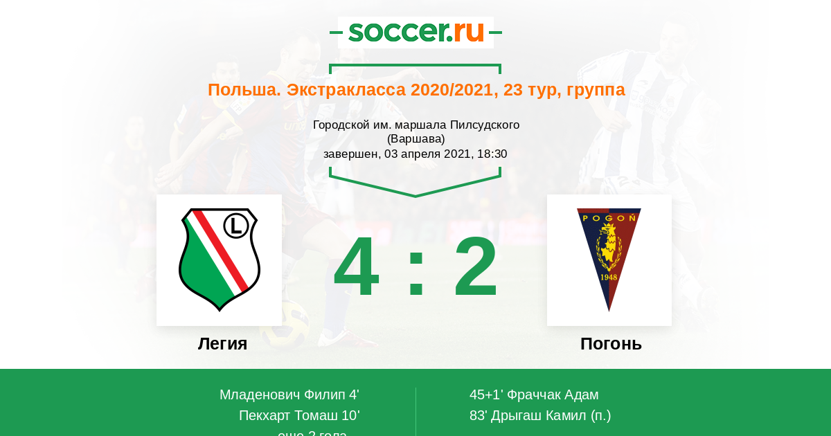 Польша. Экстракласса 07.04.2018 Легия Логотип футбольный клуб Легия (Варшава) 3:0 Логотип футбольный клуб Погонь (Щецин) Погонь