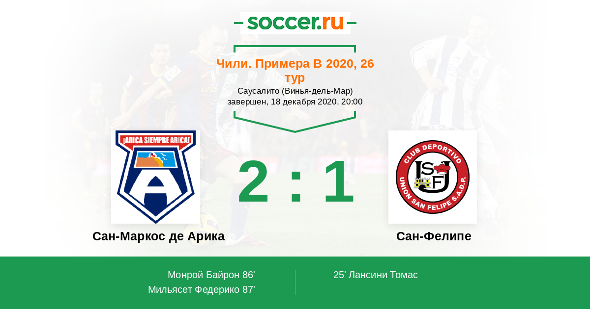 Чили. Примера В 11.09.2016 Сан-Маркос де Арика Логотип футбольный клуб Сан-Маркос де Арика 1:0 Логотип футбольный клуб Сан-Фелипе (Сан Фелипе) Сан-Фелипе