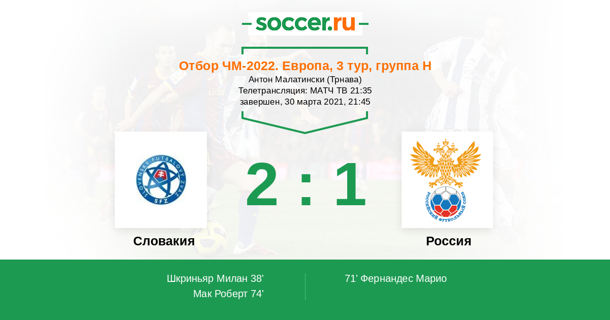 Вспомнилась фраза из анекдота: " По мотивам игры сборной России был снят фильм ужасов." Пока Джикия с Фернандесом обнимались, Шкриньяр забил и сломал всю тактику, которая видимо заключалась в надежде два тайма протусовать мяч между центральными защитника и вратарем изредка пиная его вперед. Во втором тайме удалось один затолкать и практически тут же получить в свои. Шунин не выручает, скорости отсутствуют, комбинационная игра практически тоже, вся надежда на навесы, но сегодня не судьба. Словакия особо выдающегося тоже ничего не показала, но победу добыла. А вообще складывается впечатление, что волей жребия в нашу группу собрали "ходячих мертвецов." И кто окажется чуть живее, тот и получит заветный билет. Как обычно личное мнение.