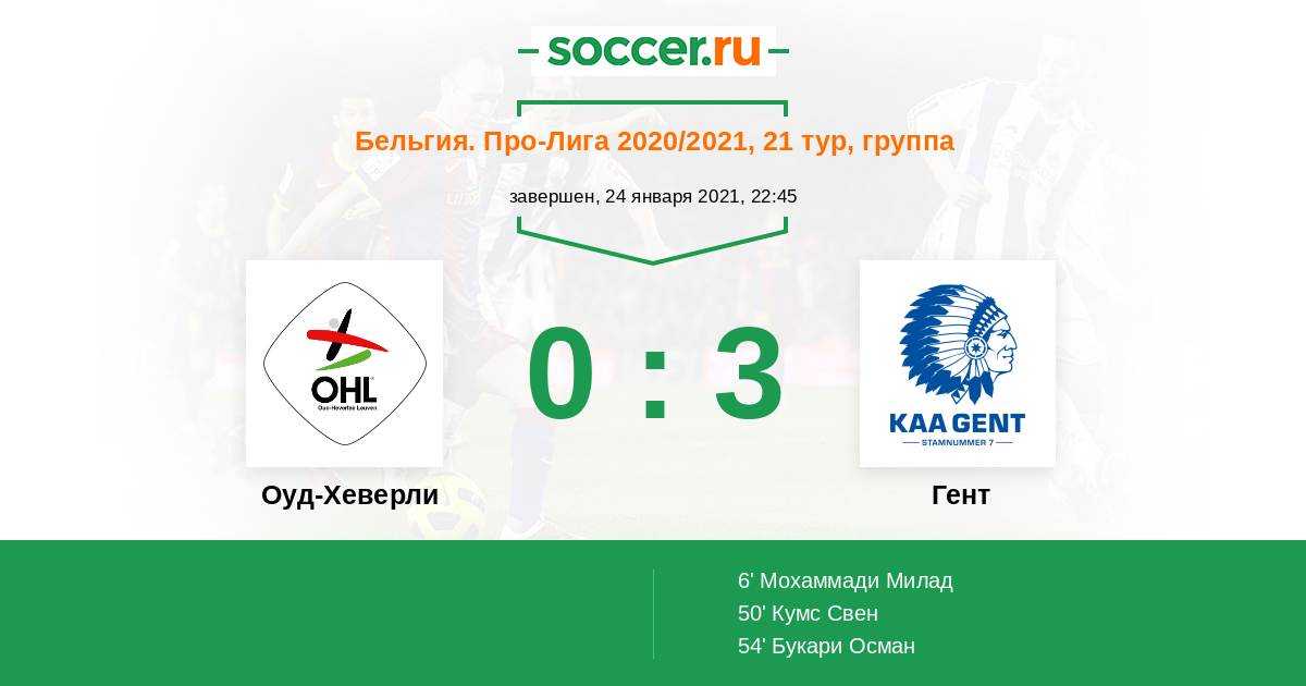 Бельгия. Про-Лига 26.09.2020 Гент Логотип футбольный клуб Гент 2:3 Логотип футбольный клуб Оуд-Хеверли (Левен) Оуд-Хеверли
