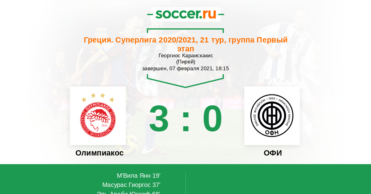 Греция. Суперлига 27.02.2022 Олимпиакос Логотип футбольный клуб Олимпиакос (Пирей) 2:0 Логотип футбольный клуб ОФИ (Ираклион) ОФИ