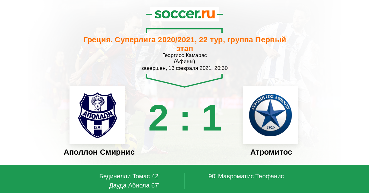 Греция. Суперлига 03.04.2021 Атромитос Логотип футбольный клуб Атромитос (Перистери) 1:1 Логотип футбольный клуб Аполлон Смирнис (Афины) Аполлон Смирнис