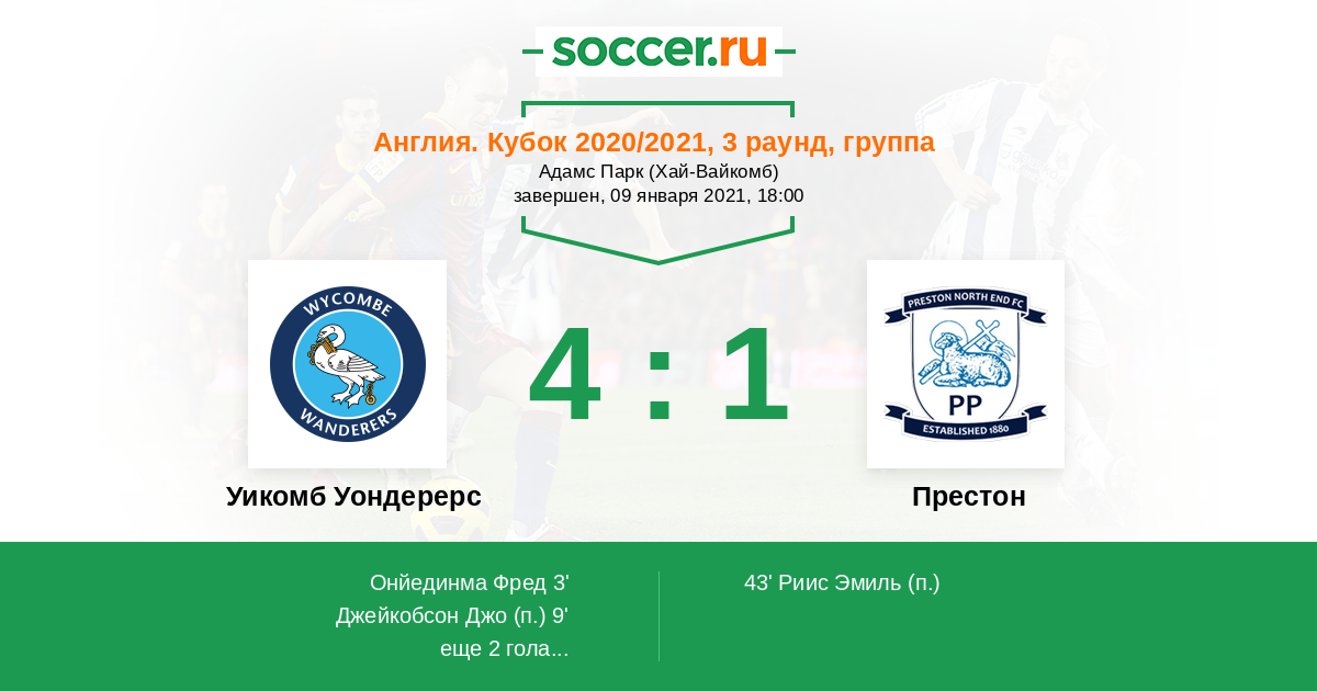 Англия. Кубок 06.01.2018 Уикомб Уондерерс Логотип футбольный клуб Уикомб Уондерерс (Хай-Вайкомб) 1:5 Логотип футбольный клуб Престон Престон