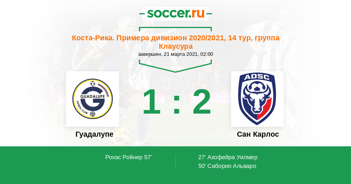 Коста-Рика. Примера дивизион 21.01.2021 Сан Карлос Логотип футбольный клуб Сан Карлос (Сьюдад Куэсада) 1:0 Логотип футбольный клуб Гуадалупе Гуадалупе