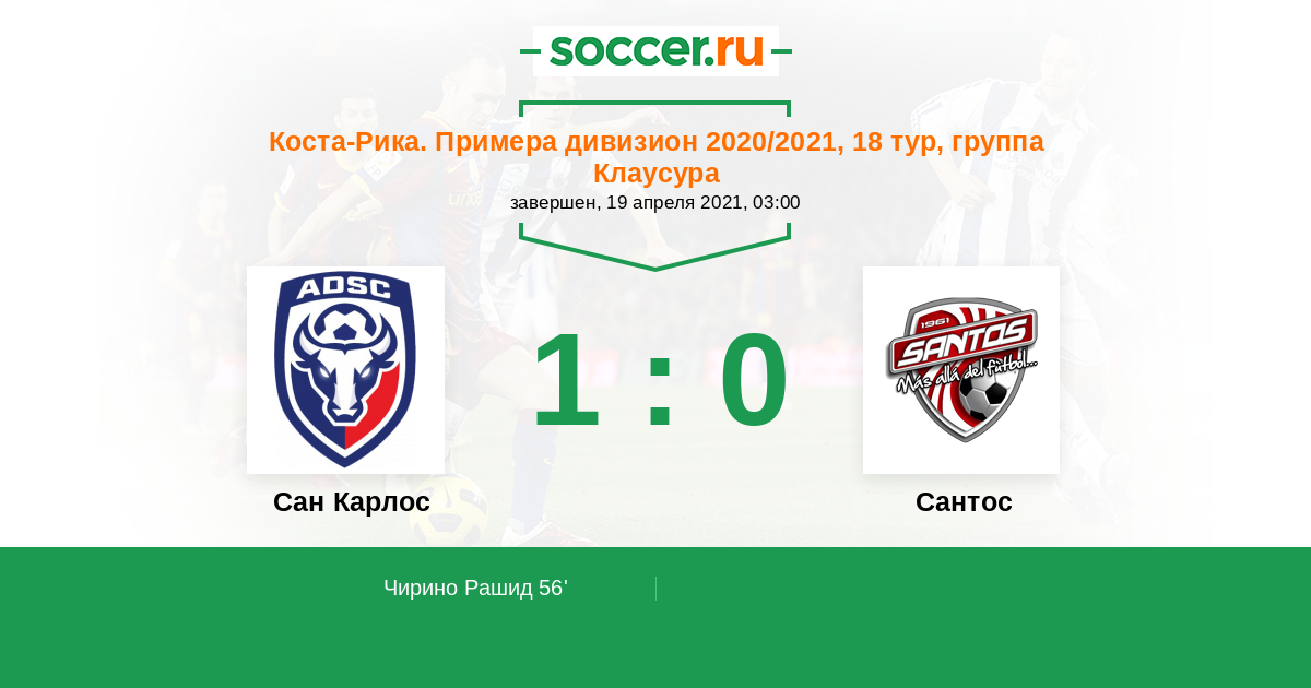 Коста-Рика. Примера дивизион 06.02.2020 Сантос Логотип футбольный клуб Сантос (Гуапилес) 5:2 Логотип футбольный клуб Сан Карлос (Сьюдад Куэсада) Сан Карлос