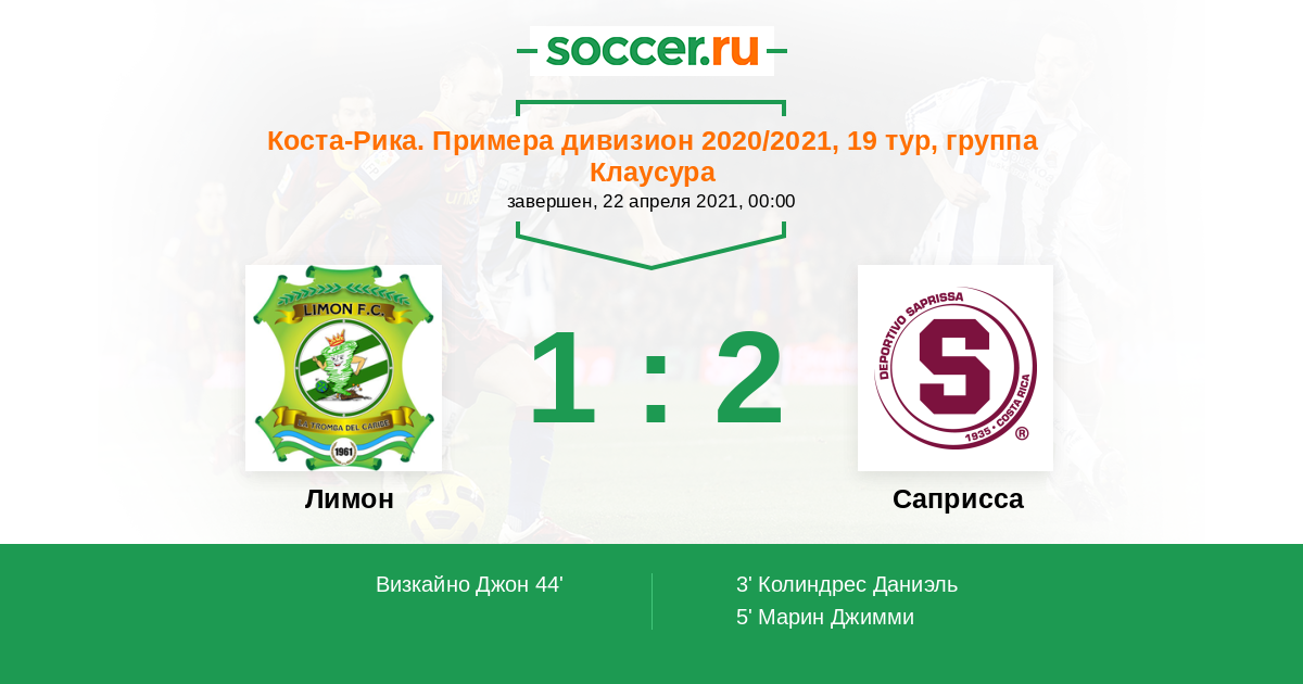 Коста-Рика. Примера дивизион 23.04.2017 Лимон Логотип футбольный клуб Лимон 5:1 Логотип футбольный клуб Саприсса (Сан Хосе) Саприсса