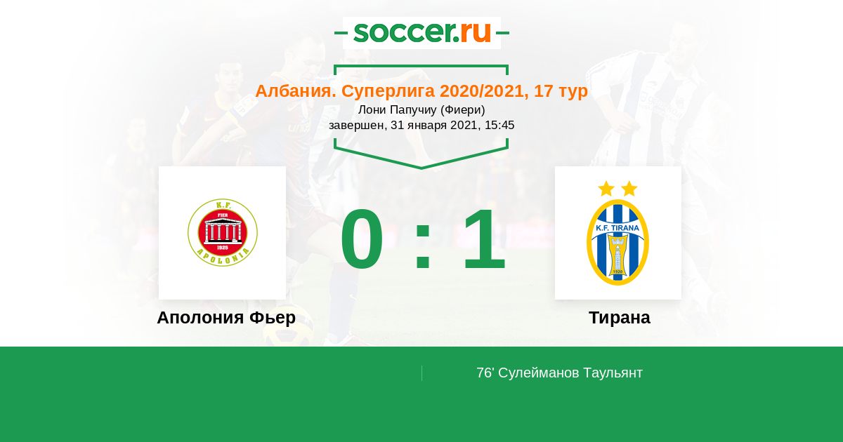 Албания. Суперлига 24.01.2015 Тирана Логотип футбольный клуб Тирана 2:0 Логотип футбольный клуб Аполония Фьер Аполония Фьер