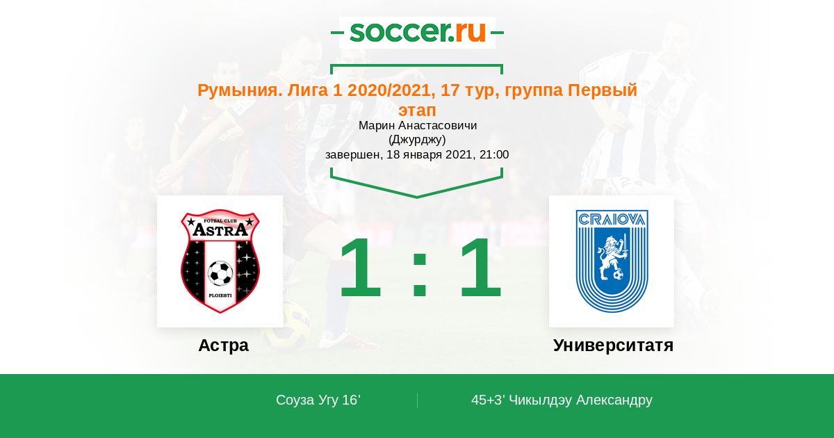 Румыния. Лига 1 11.03.2017 Астра Логотип футбольный клуб Астра (Джурджу) 0:0 Логотип футбольный клуб Университатя Крайова Университатя Крайова
