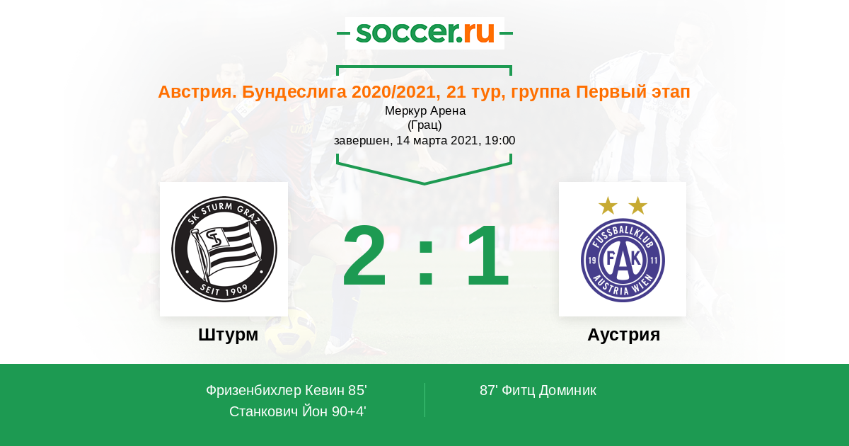 Австрия. Бундеслига 21.10.2018 Аустрия Логотип футбольный клуб Аустрия (Вена) 1:1 Логотип футбольный клуб Штурм (Грац) Штурм