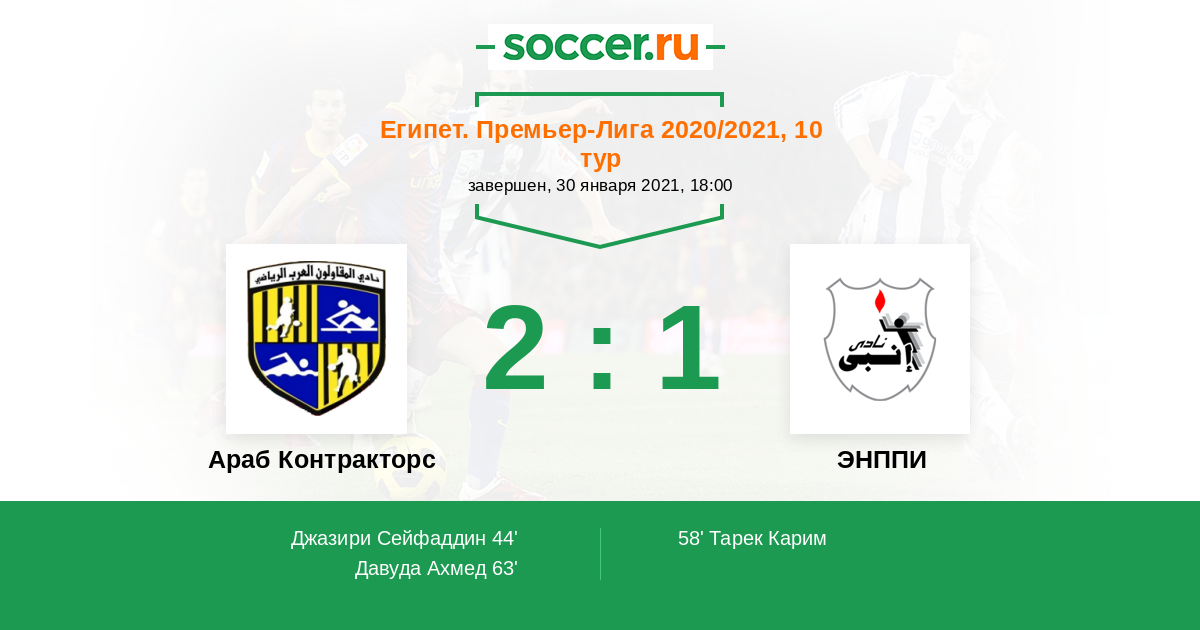 Египет. Премьер-Лига 15.10.2020 Араб Контракторс Логотип футбольный клуб Араб Контракторс (Каир) 0:2 Логотип футбольный клуб ЭНППИ (Каир) ЭНППИ