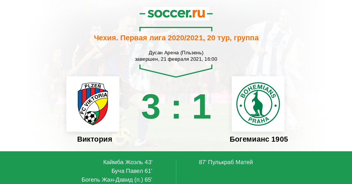 Чехия. Первая Лига 19.09.2020 Богемианс 1905 Логотип футбольный клуб Богемианс 1905 (Прага) 1:4 Логотип футбольный клуб Виктория (Пльзень) Виктория