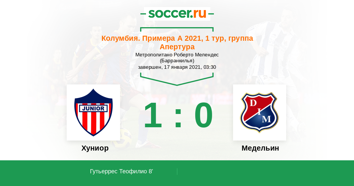 Колумбия. Примера А 17.02.2022 Медельин Логотип футбольный клуб Медельин 2:0 Логотип футбольный клуб Хуниор (Барранкилья) Хуниор