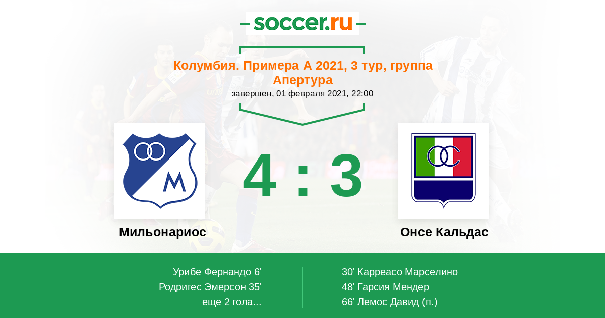 Колумбия. Примера А 02.08.2021 Онсе Кальдас Логотип футбольный клуб Онсе Кальдас (Манисалес) 0:2 Логотип футбольный клуб Мильонариос (Богота) Мильонариос