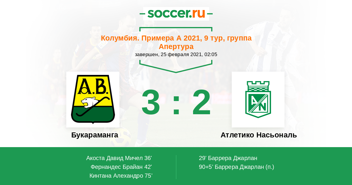 Колумбия. Примера А 28.02.2022 Букараманга Логотип футбольный клуб Букараманга 3:1 Логотип футбольный клуб Атлетико Насьональ (Медельин) Атлетико Насьональ