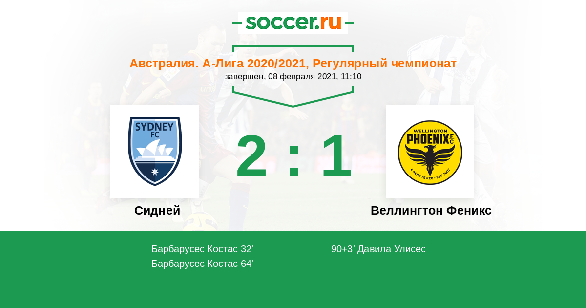 Австралия. А-Лига 02.01.2021 Веллингтон Феникс Логотип футбольный клуб Веллингтон Феникс 1:2 Логотип футбольный клуб Сидней Сидней
