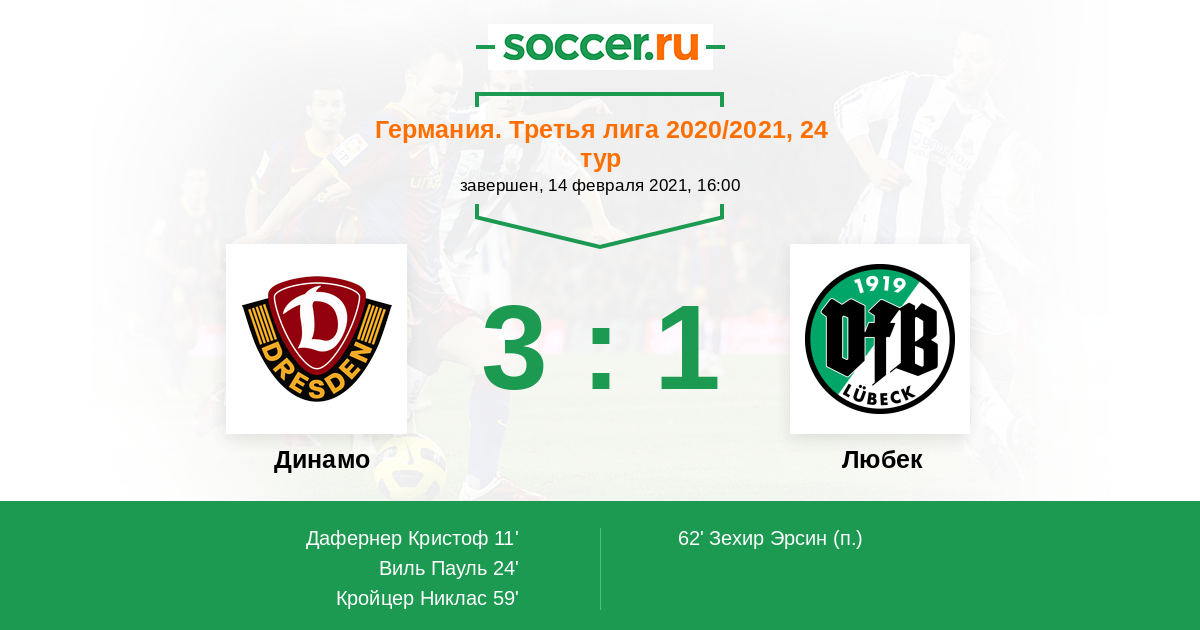 Германия. Третья лига 17.10.2020 Любек Логотип футбольный клуб Любек 0:1 Логотип футбольный клуб Динамо (Дрезден) Динамо