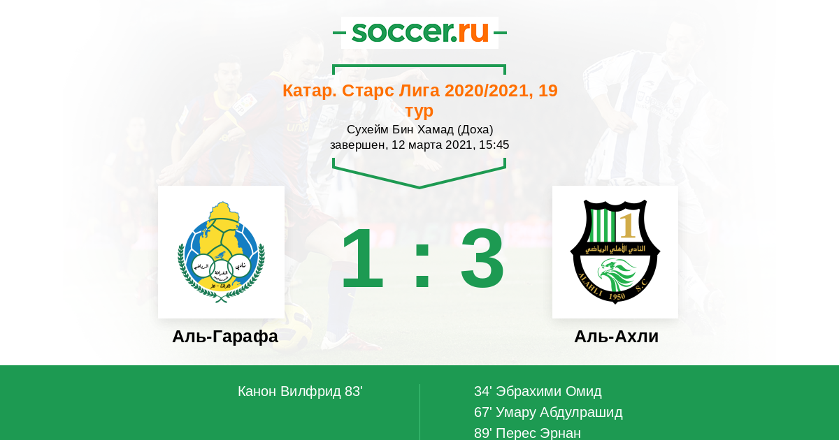Катар. Старс Лига 16.03.2012 Аль-Ахли Логотип футбольный клуб Аль-Ахли (Доха) 1:4 Логотип футбольный клуб Аль-Гарафа (Доха) Аль-Гарафа