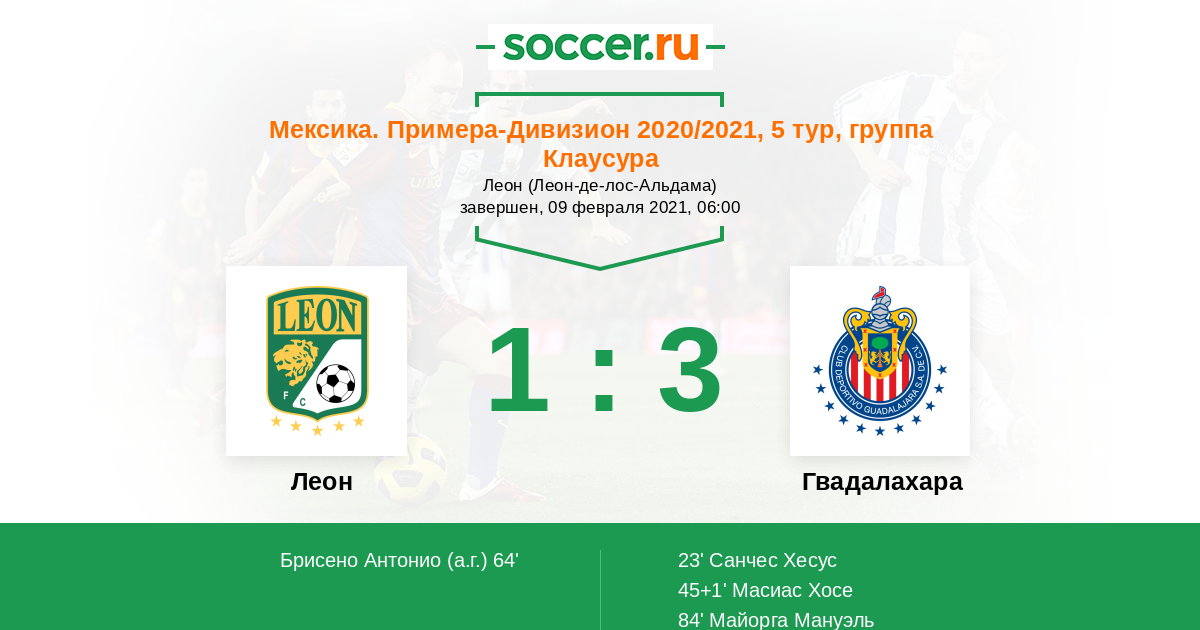 Мексика. Примера-Дивизион 06.12.2020 Леон Логотип футбольный клуб Леон 1:0 Логотип футбольный клуб Гвадалахара Гвадалахара