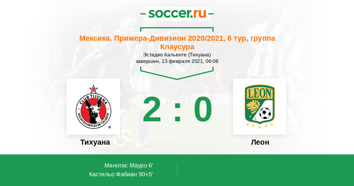 Мексика. Примера-Дивизион 18.08.2020 Леон Логотип футбольный клуб Леон 2:1 Логотип футбольный клуб Тихуана Тихуана