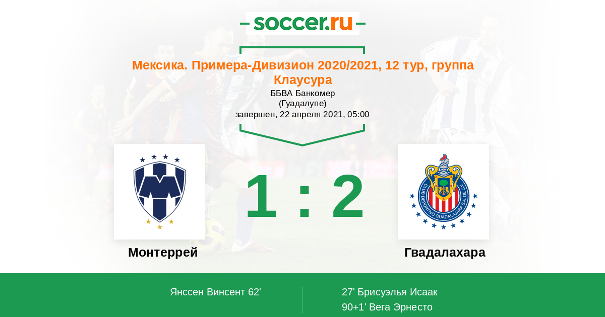 Мексика. Примера-Дивизион 21.10.2019 Монтеррей Логотип футбольный клуб Монтеррей 1:1 Логотип футбольный клуб Гвадалахара Гвадалахара
