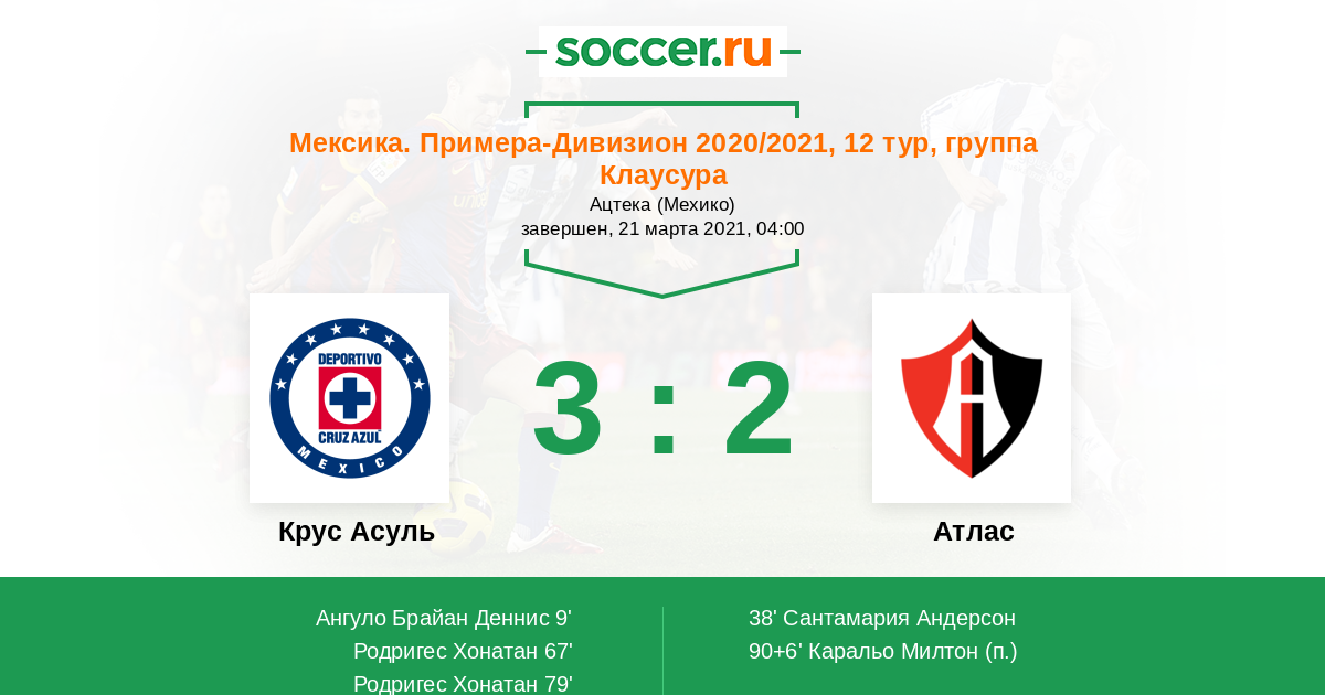Мексика. Примера-Дивизион 20.03.2016 Атлас Логотип футбольный клуб Атлас (Гвадалахара) 0:2 Логотип футбольный клуб Крус Асуль (Мехико) Крус Асуль