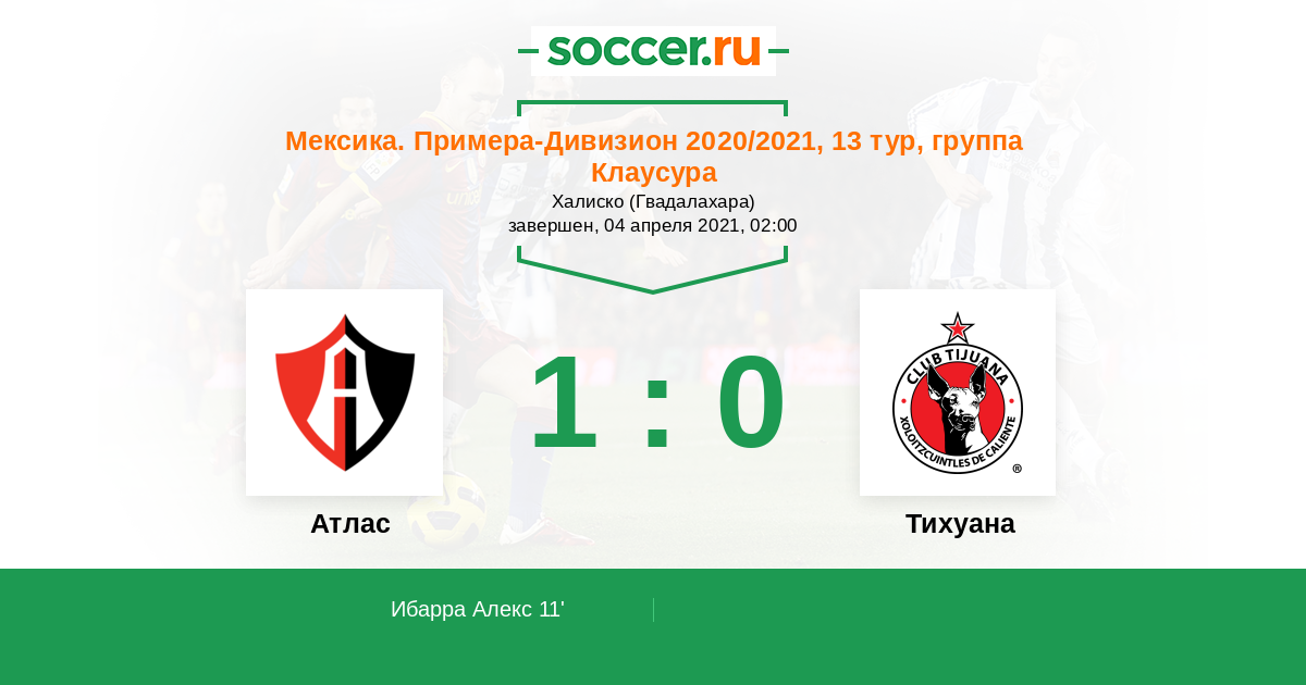 Мексика. Примера-Дивизион 21.10.2017 Атлас Логотип футбольный клуб Атлас (Гвадалахара) 1:0 Логотип футбольный клуб Тихуана Тихуана
