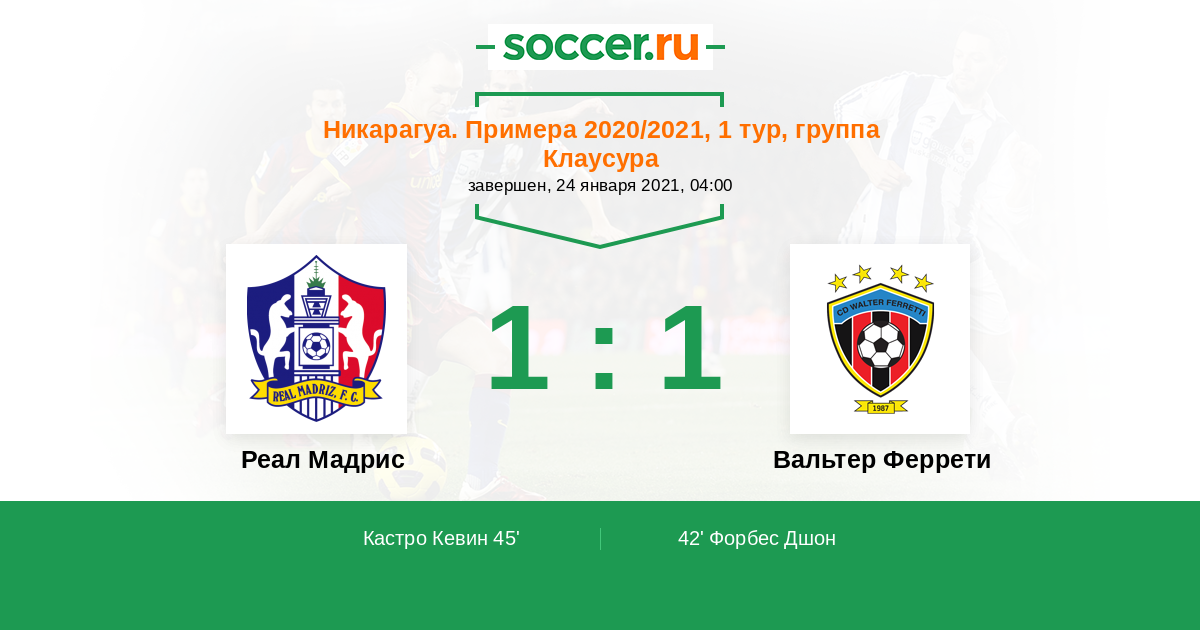 Никарагуа. Примера 07.03.2021 Вальтер Феррети Логотип футбольный клуб Вальтер Феррети (Манагуа) 2:0 Логотип футбольный клуб Реал Мадрис (Сомото) Реал Мадрис