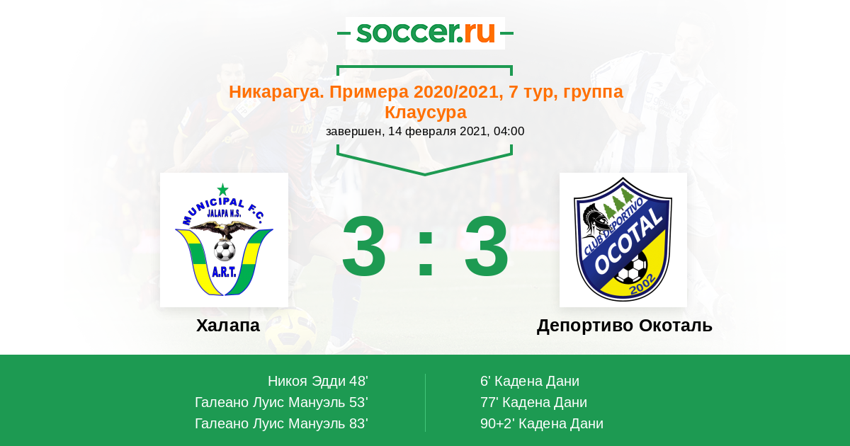 Никарагуа. Примера 04.03.2024 Халапа Логотип футбольный клуб Халапа (Окоталь) 2:2 Логотип футбольный клуб Депортиво Окоталь Депортиво Окоталь